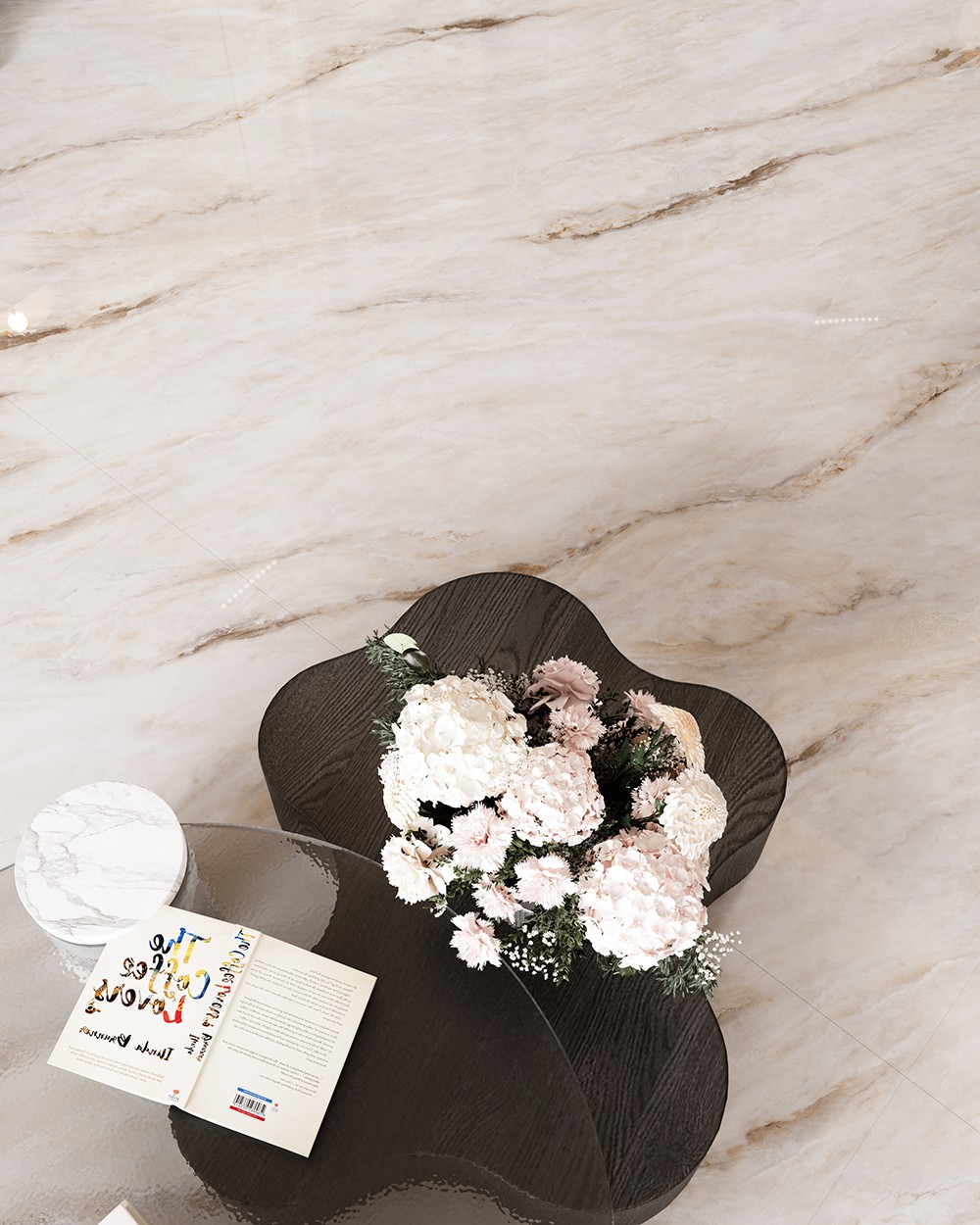 冷调基底蕴冰晶之韵,米棕纹理漾晨光暖意,彩晶干粒勾勒冬去春来的含蓄渐变。