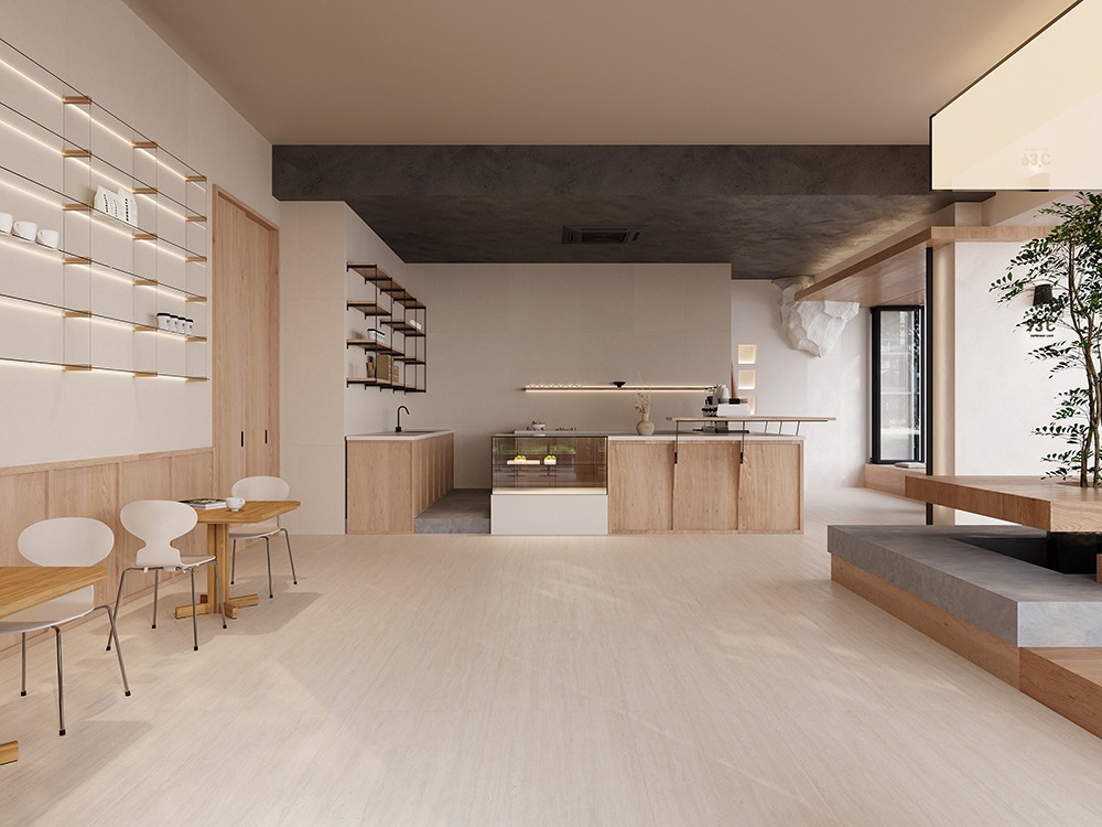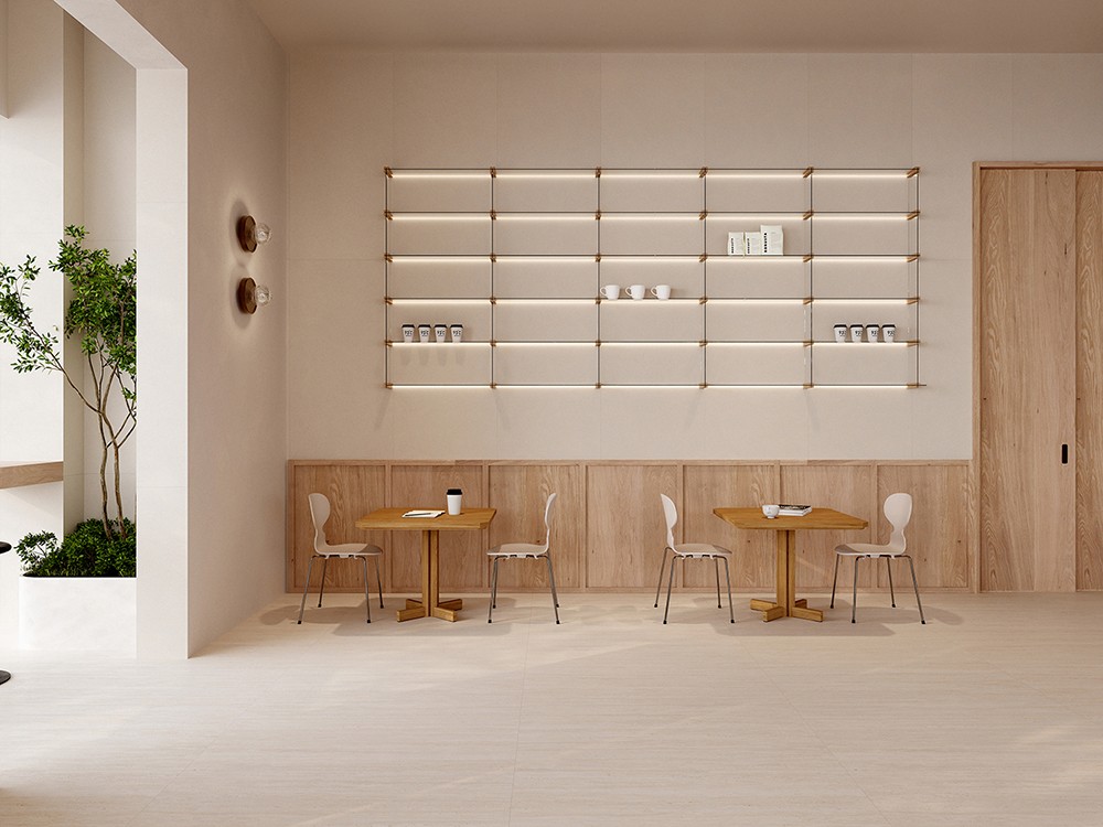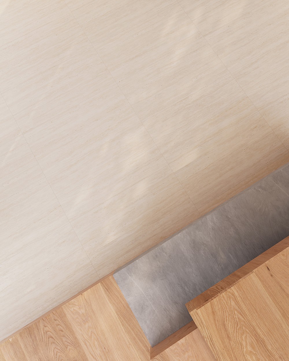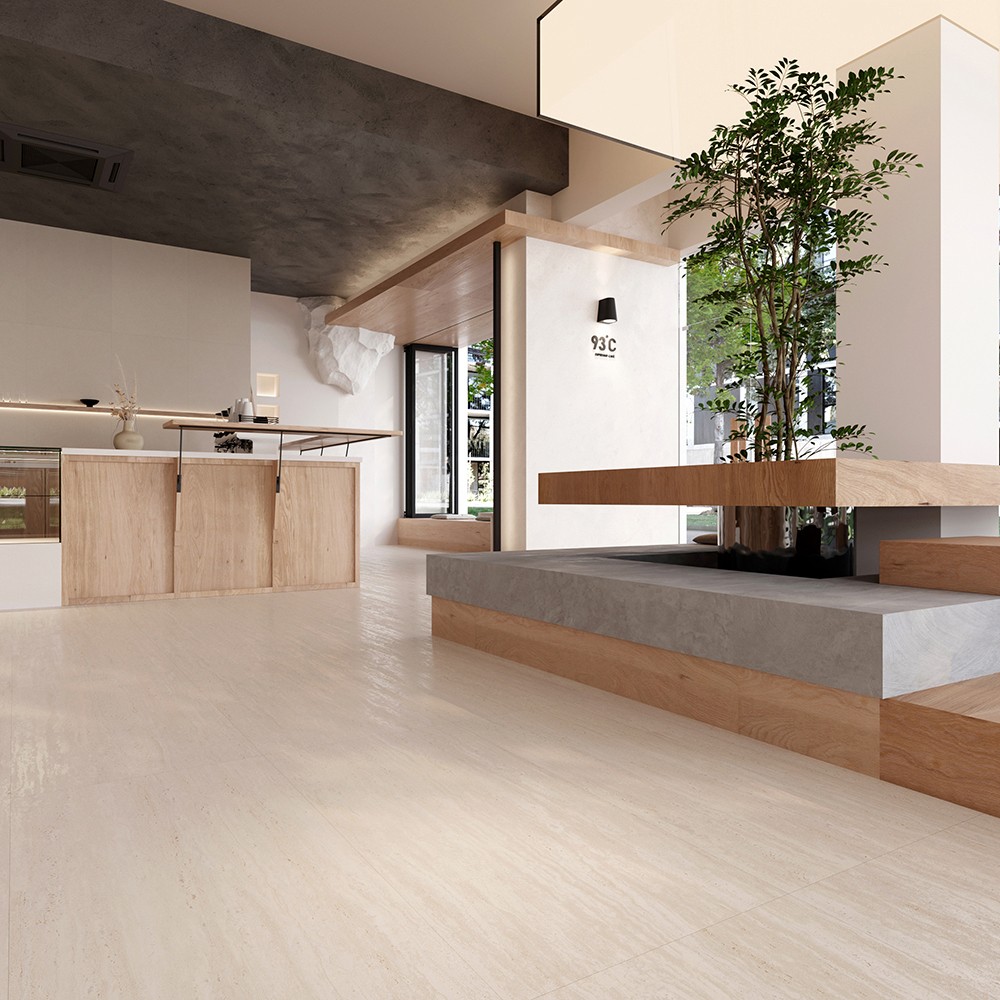 米白基底之上,细腻洞石纹理如微孔密布、疏密有致,柔和光影间透出天然石材的温润呼吸感。