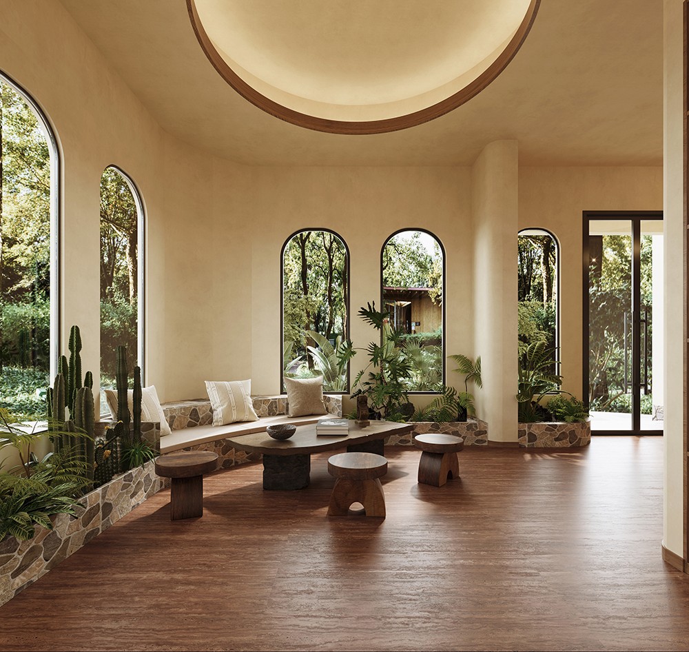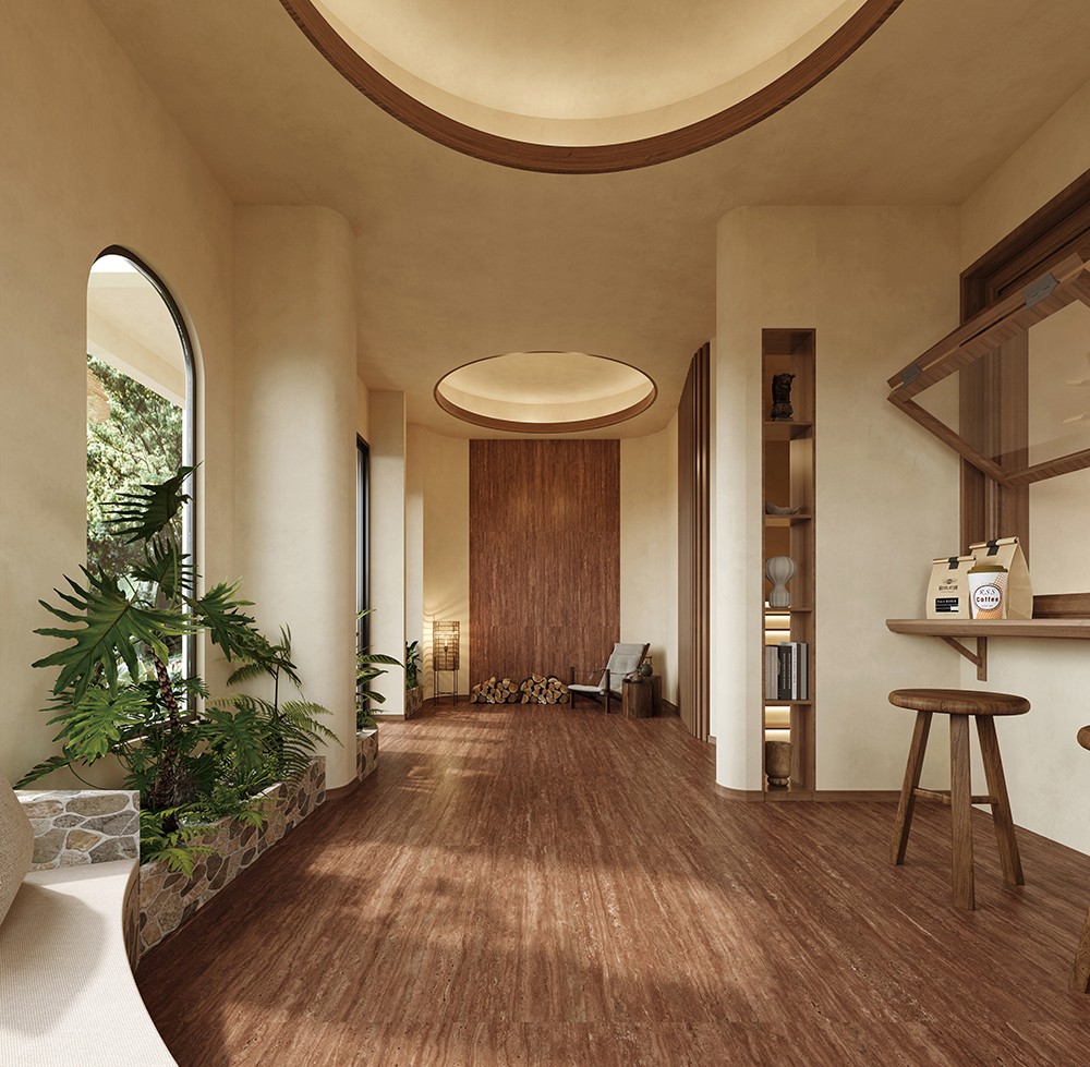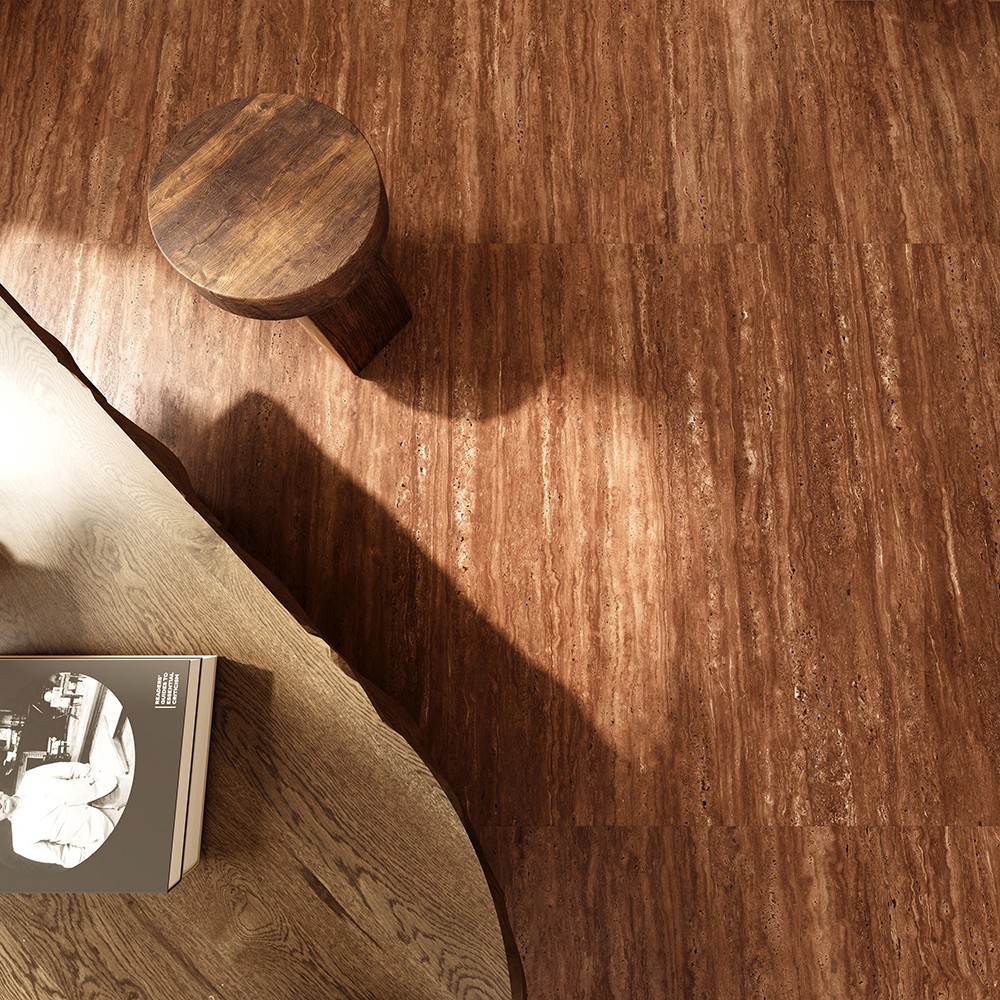 红棕色调承载粗犷洞石纹理,孔洞错落、纹路苍劲,仿若岁月雕琢的天然岩壁,沉稳而富有故事感。